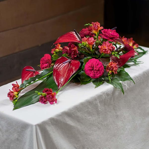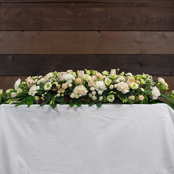 Kuvan tyylikäs arkkulaite sisältää valkoista perhoskämmekkää, hortensiaa ja arabiantähdikkiä. Kuvan työ 180 €.