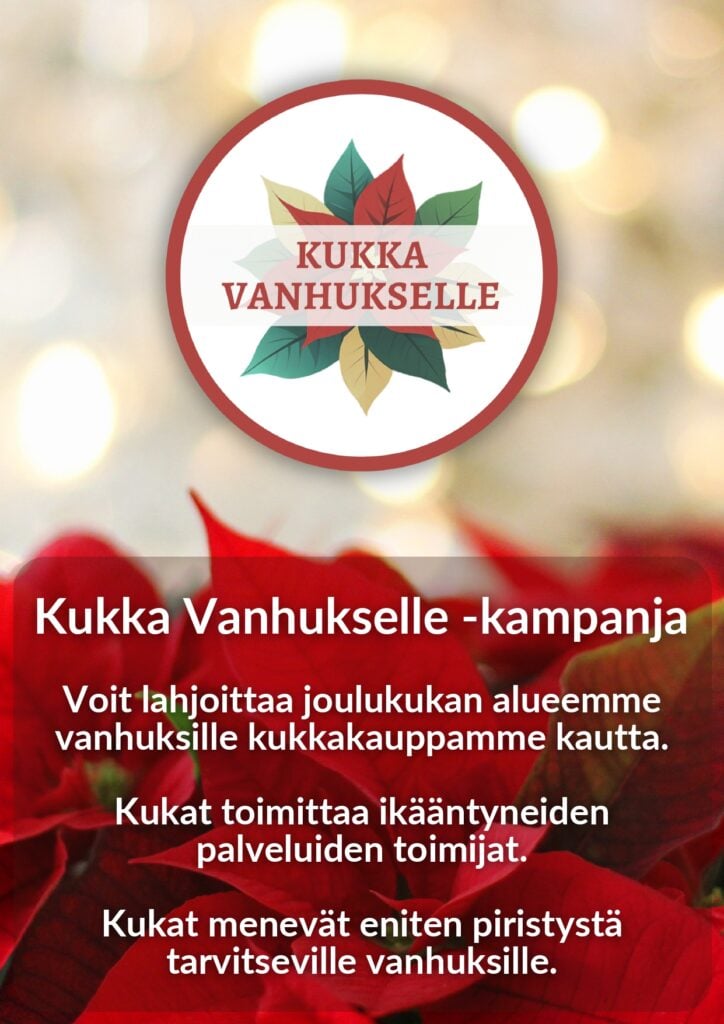 Lähetä kukkia ystävällesi, rakkaallesi, läheisellesi tai vaikka omalle kotiovellesi vaivatta tilaamalla kukat verkkokaupastamme. Tutustu valikoimaamme verkossa tai tule paikan päälle myymälämme inspiroitumaan.