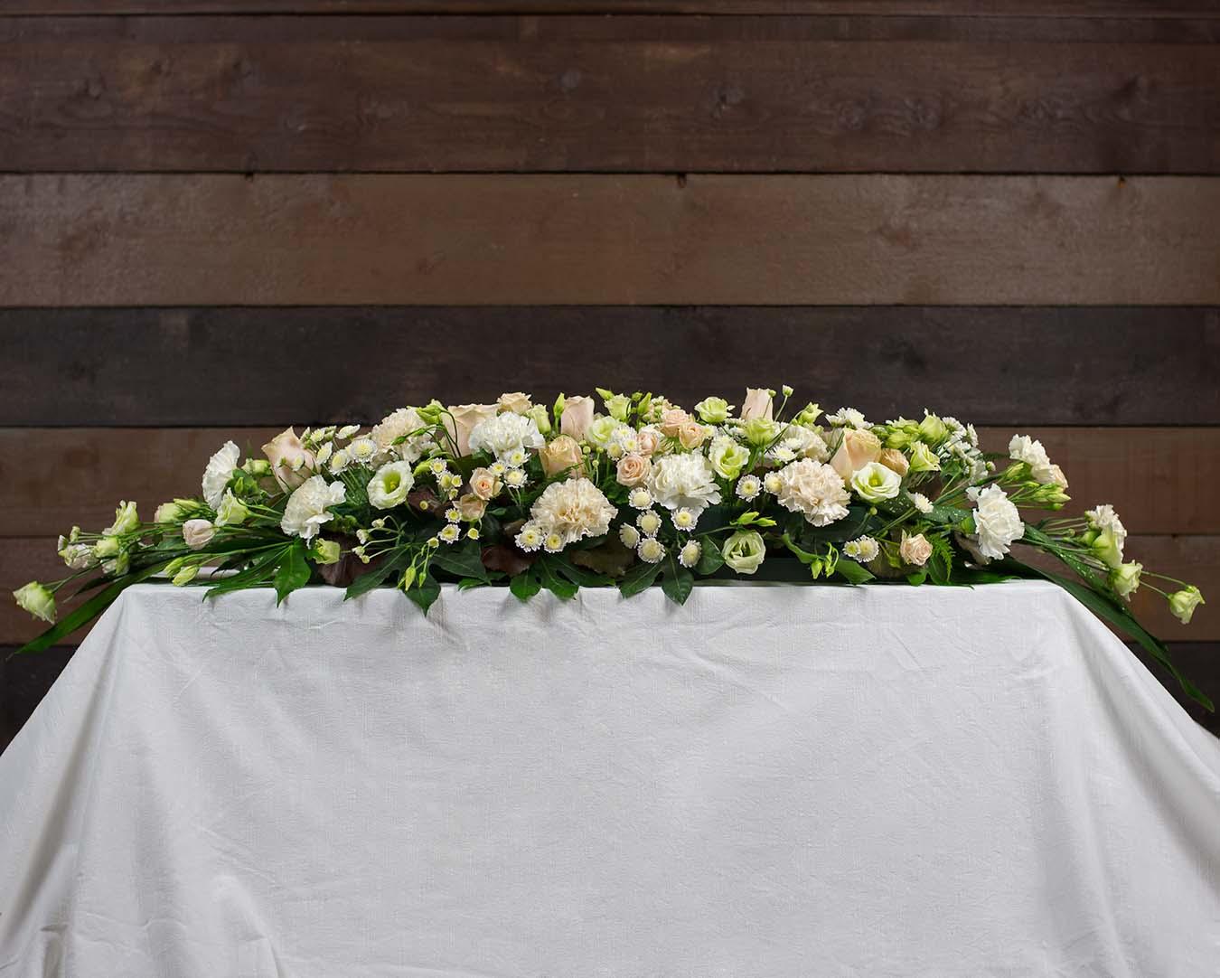 The lavish casket arrangement is approximately 150cm long. The arrangement in the picture contains carnations, roses, chrysanthemums and eustoma in shades of powder and champagne.