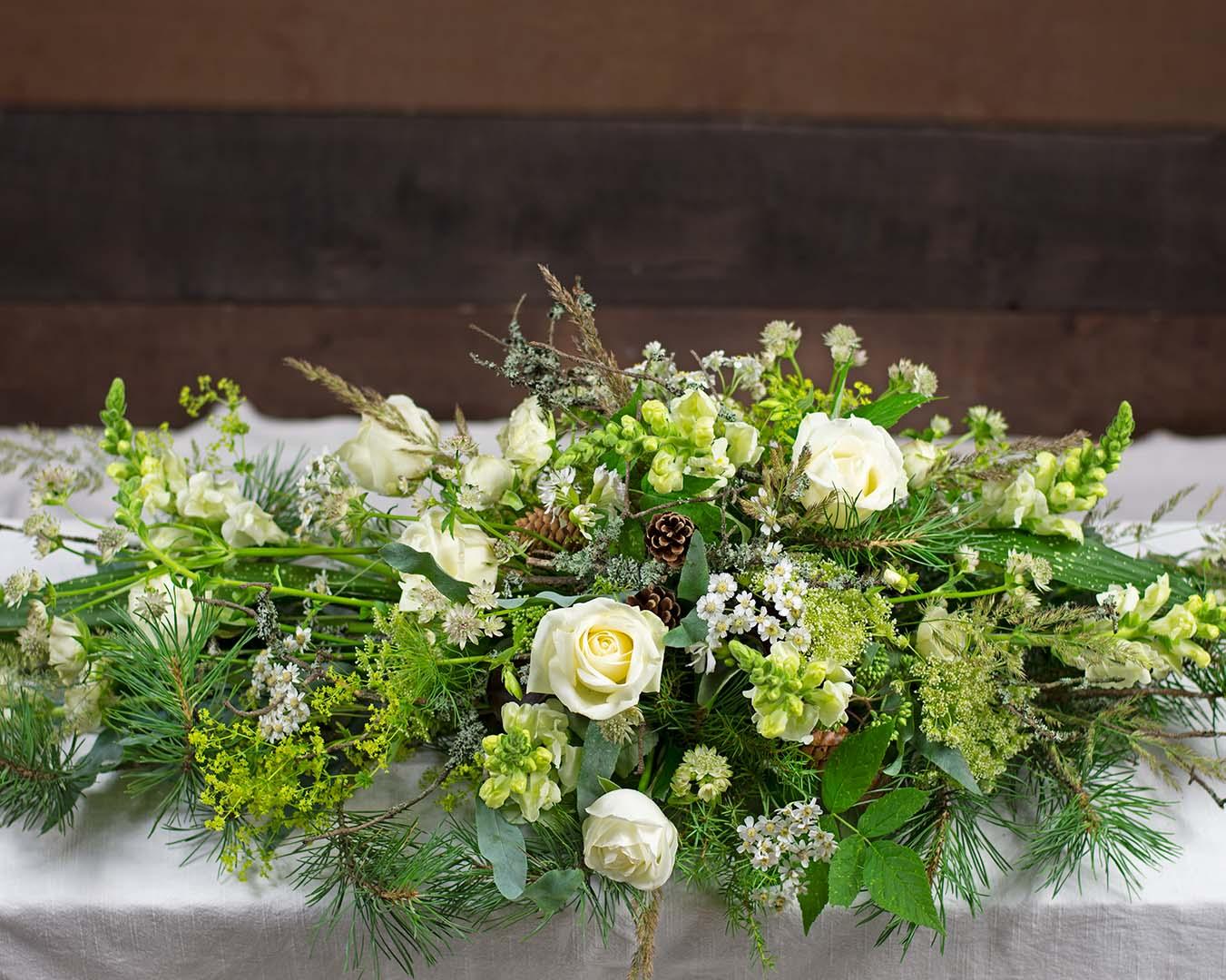The forest-inspired coffin device contains forest elements that suit the style; pine cones, conifers, raspberries, juniper, as well as roses, snapdragons, and star anemone.