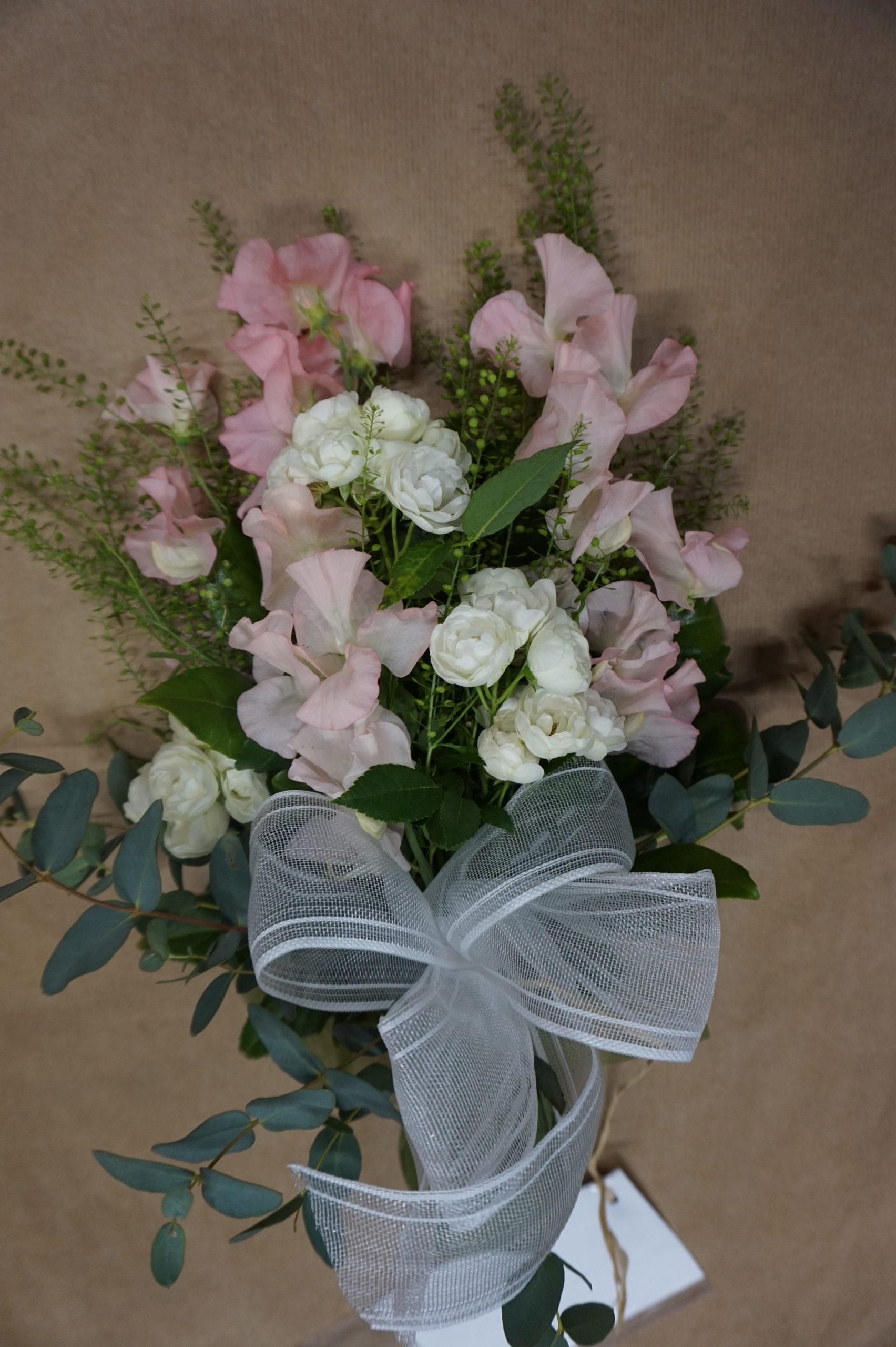 The bouquet in the photo includes summer sweet pea and branch rose.