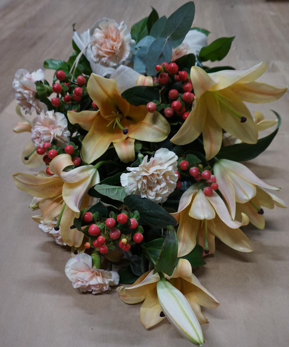 A delicate funeral bouquet containing hawthorn berries, pastel-colored lilies and carnations.