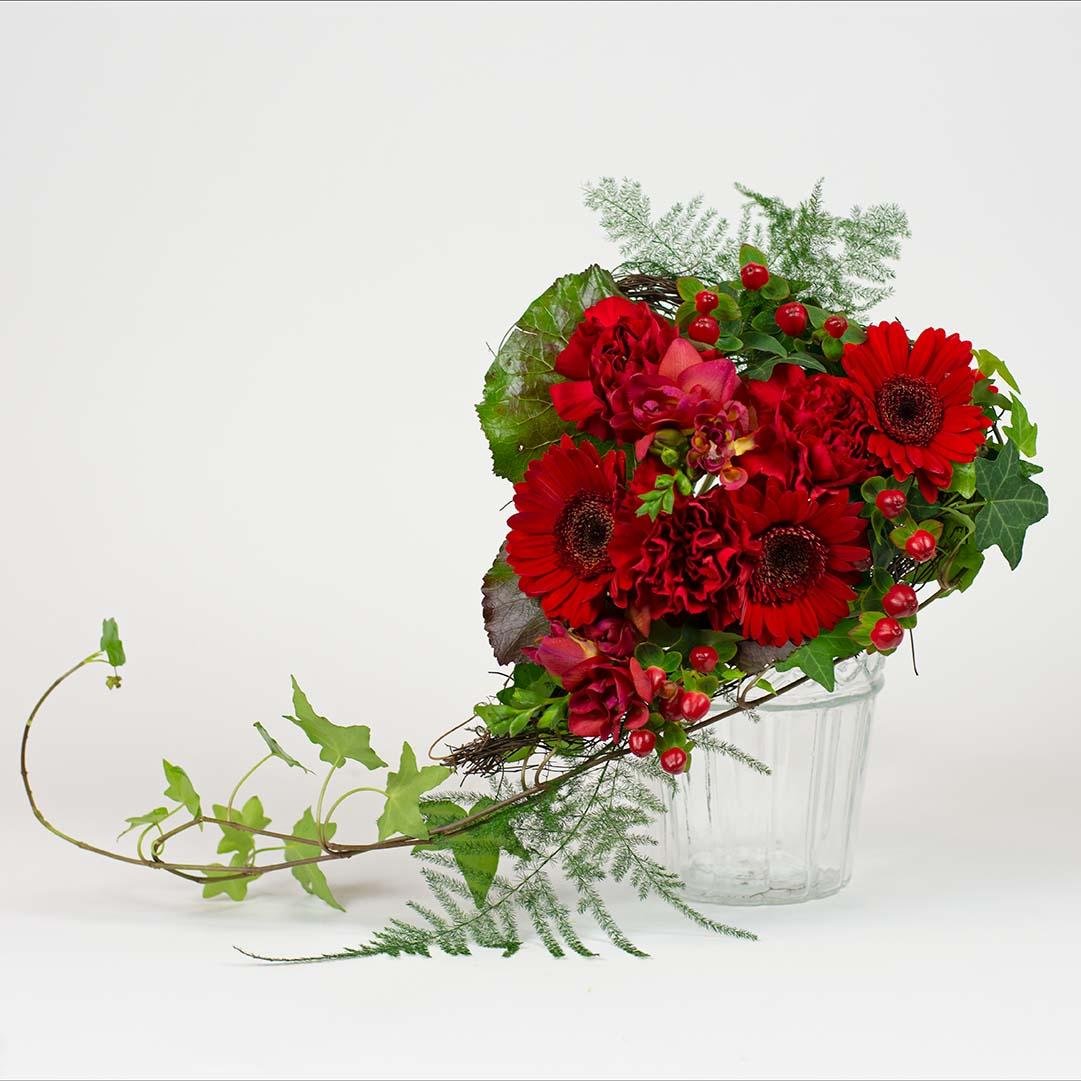 A heart-shaped bouquet of red flowers, berries and ivy branches.