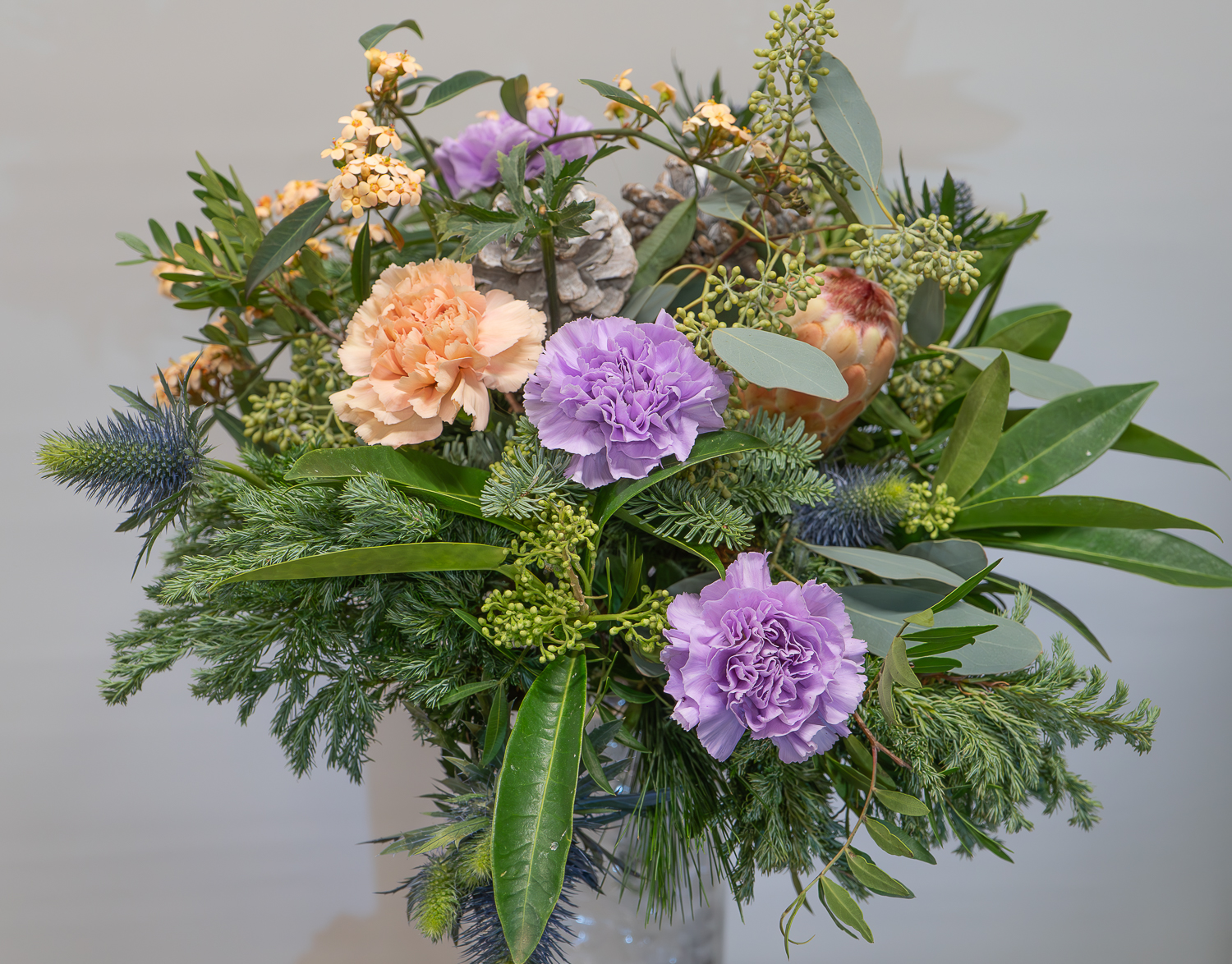 A rich and striking bouquet in a combination of pastel-colored flowers and eucalyptus berries.