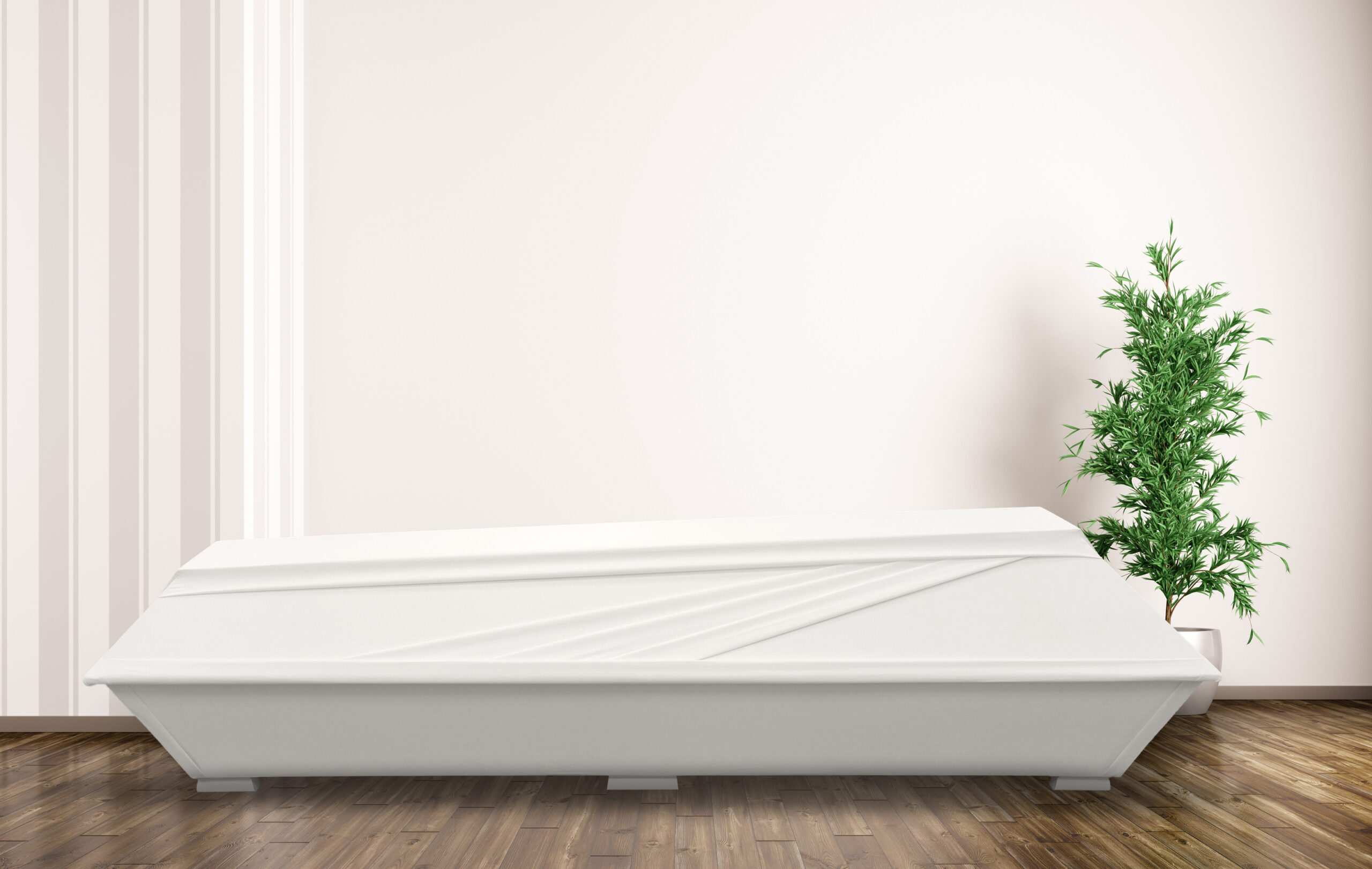 Plain white coffin upholstered with cotton featuring a wing embossment. Barem Oy.