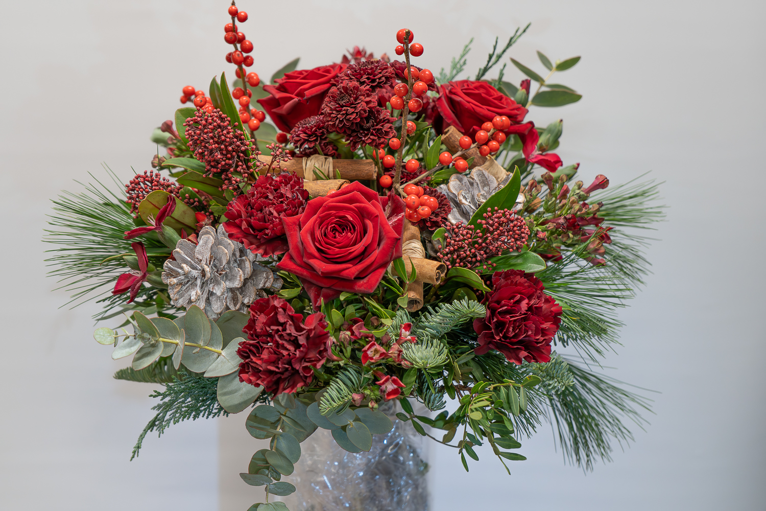 A bouquet that evokes the Christmas spirit, surrounded by red berries and white pine cones.
