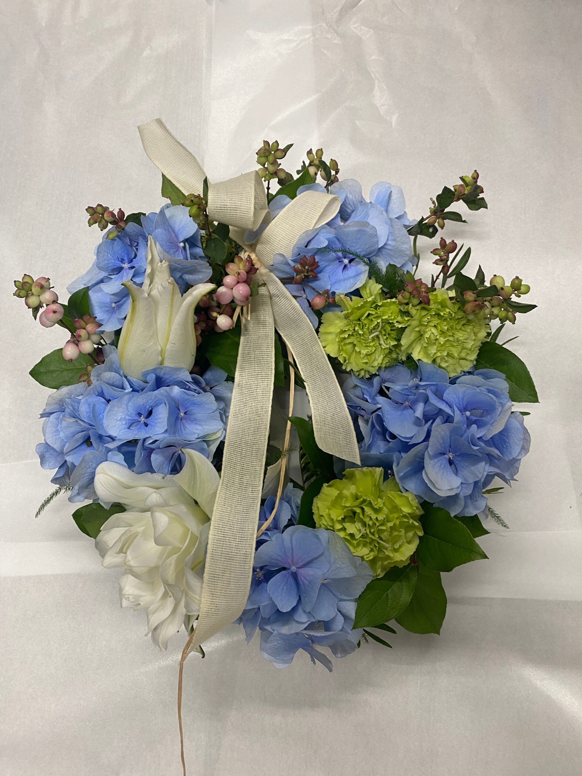 Small grave wreath, diameter approximately 25cm. Seasonal flowers.