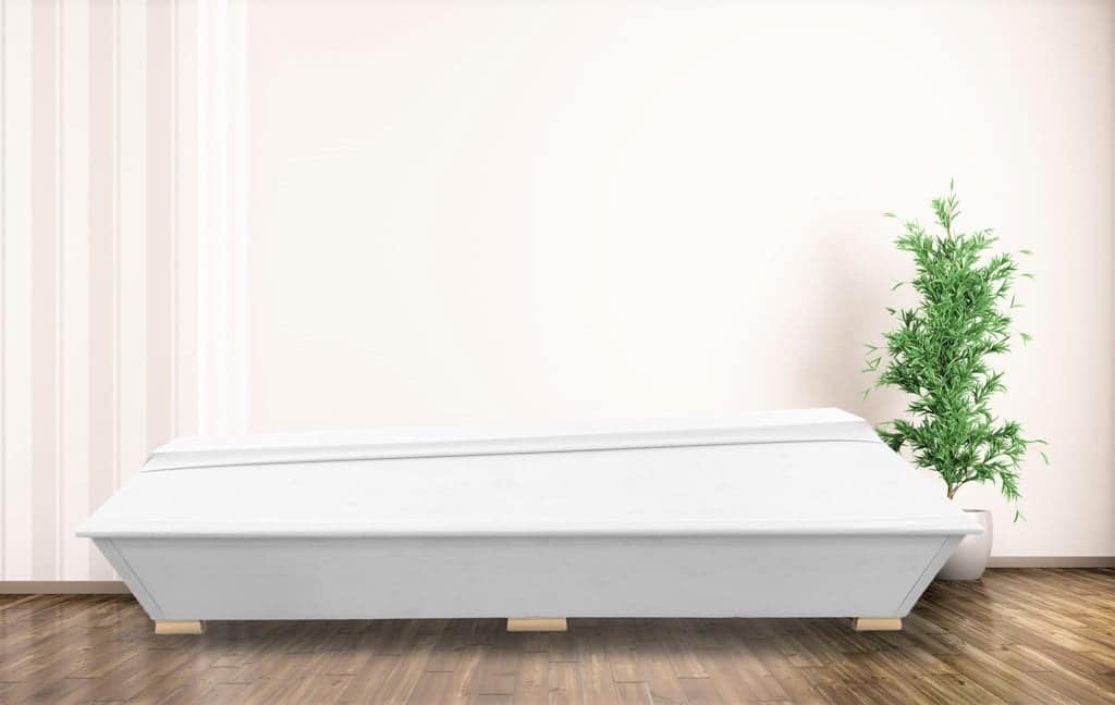 Valkoinen arkku, Valmistaja: Barem OY, Valkoinen puuvillalla verhoiltu mäntyarkku.