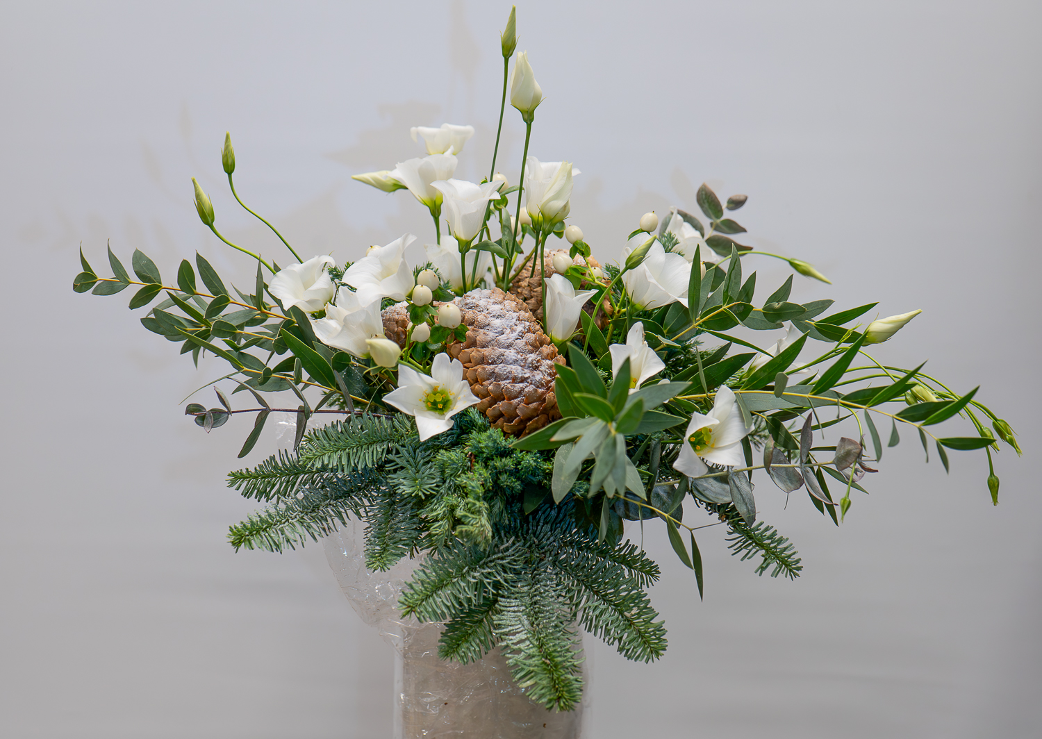 Talvinen matala kimppu eustomasta ja marjoista.