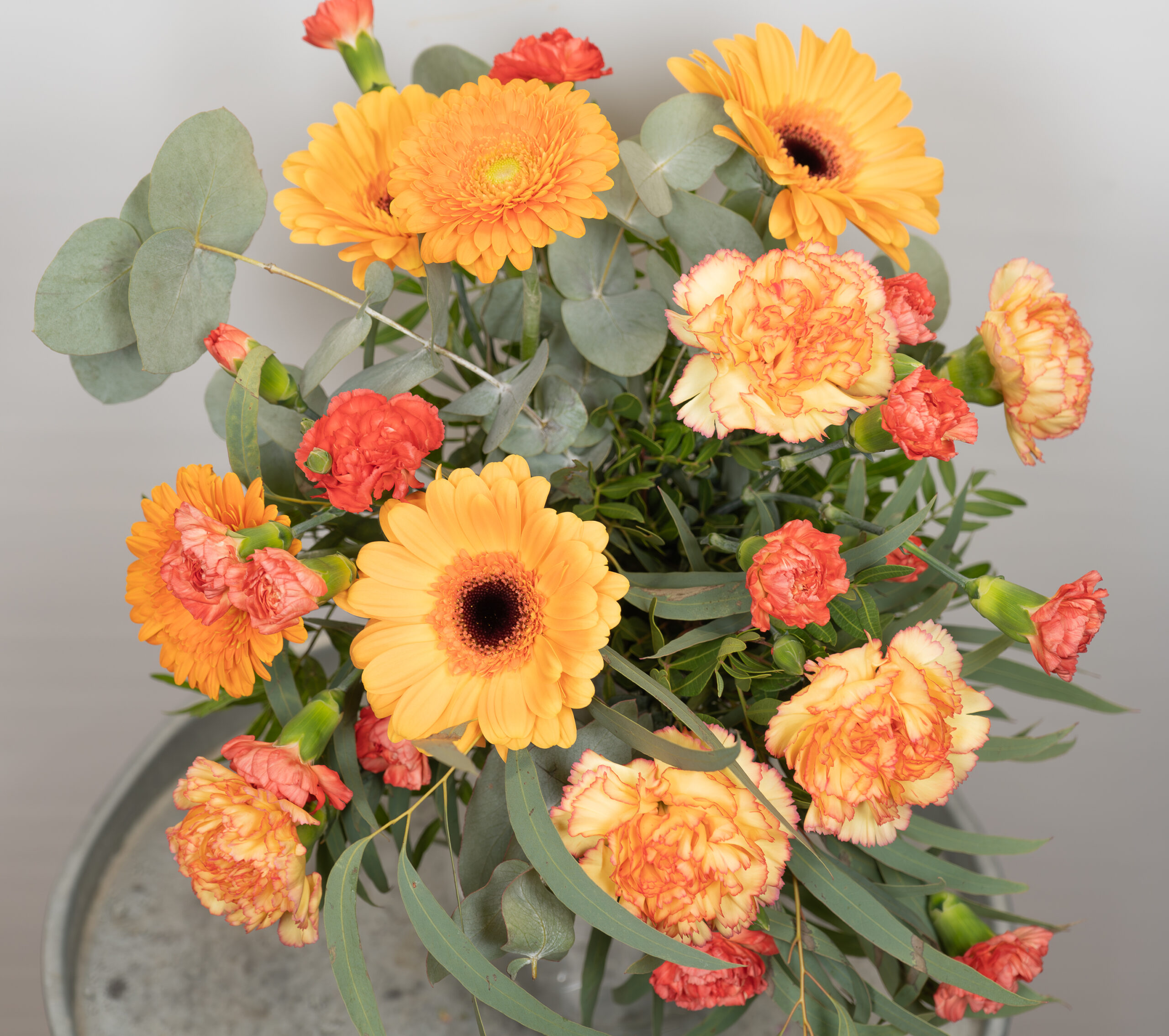 Lumoava kimppu punaisen ja keltaisen sävyissä.