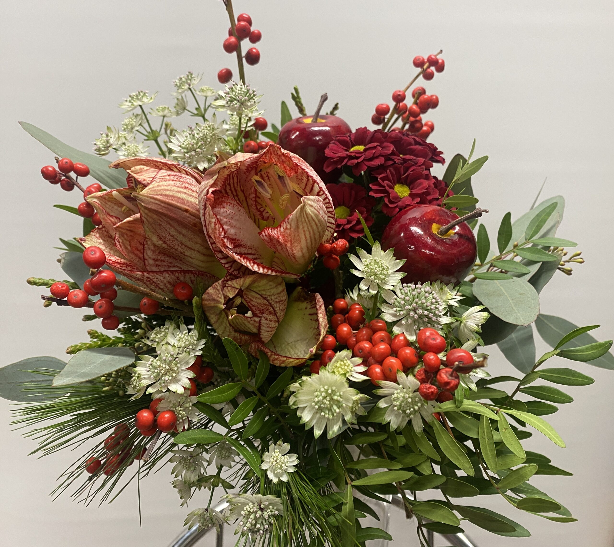 Näyttävä ja pursuava punavalkoinen kimppu täynnä Joulun tunnelmaa.