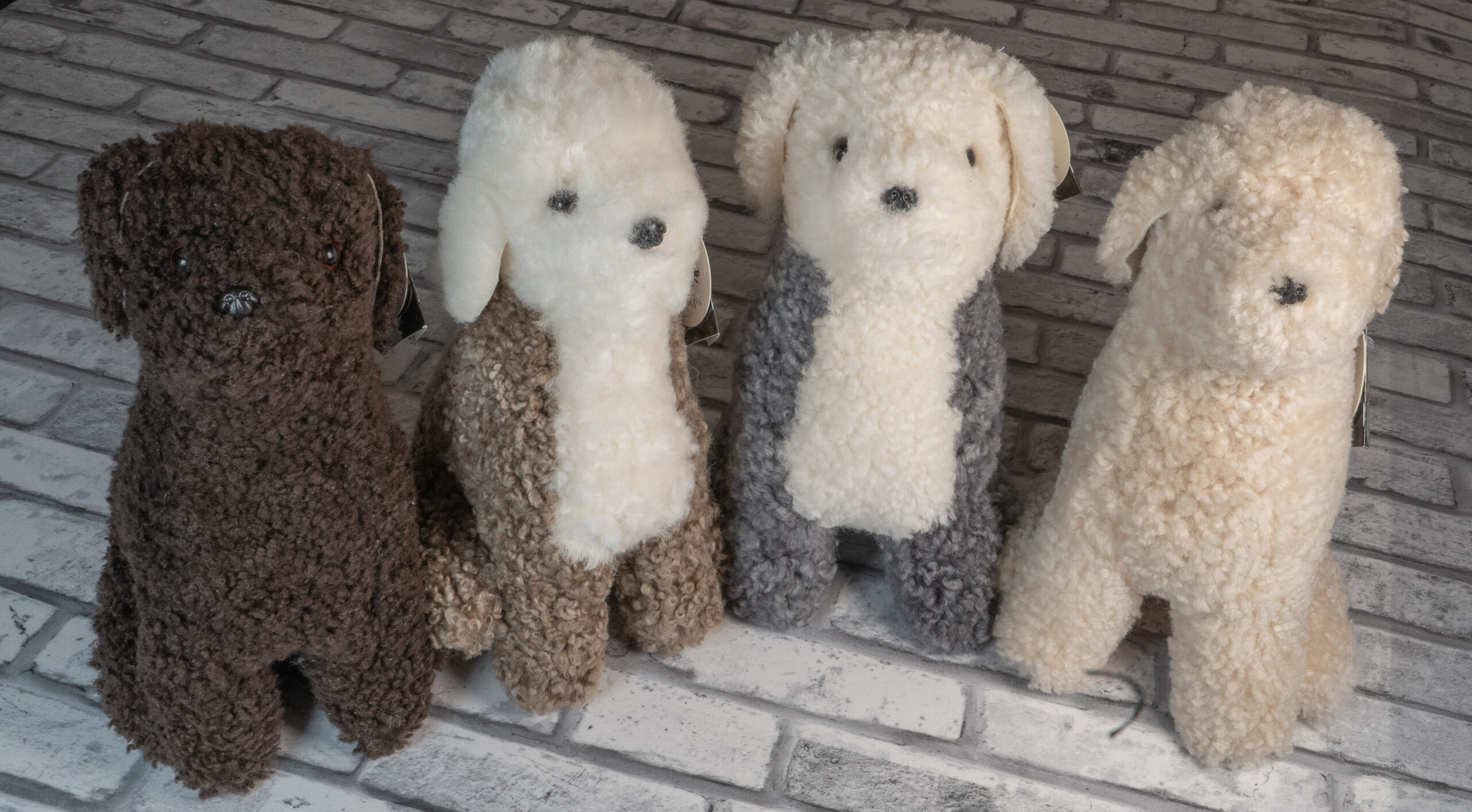 Pehmoinen koira valmistettu aidosta lampaasta. Korkeus 33cm.